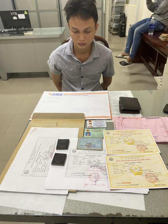 Tại hiện trường, cơ quan công an thu giữ 01 máy tính xách tay; 02 máy tính để bàn; 02 máy in màu; 01 ép nhựa; 01 thiết bị ép dấu nổi; 08 phôi bằng; 131 mẫu con dấu của các cơ quan, tổ chức; 06 điện thoại di động các loại; 02 CMND tên Đỗ Hồng Lĩnh, Nguyễn Xuân Tuấn; 01 GPLX số 36M1-082.22; 02 CMND tên Nguyễn Xuân Hải, Trần Khánh Trình và một số giấy tờ, thiết bị có liên quan đến hoạt động làm giấy tờ giả.