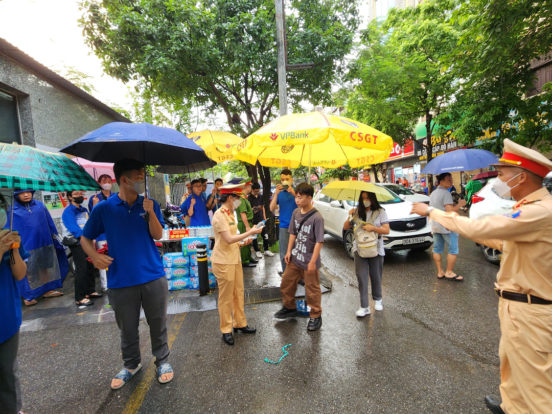 Lực lượng CSGT hỗ trợ, phát nước miến phí cho các thí sinh.
