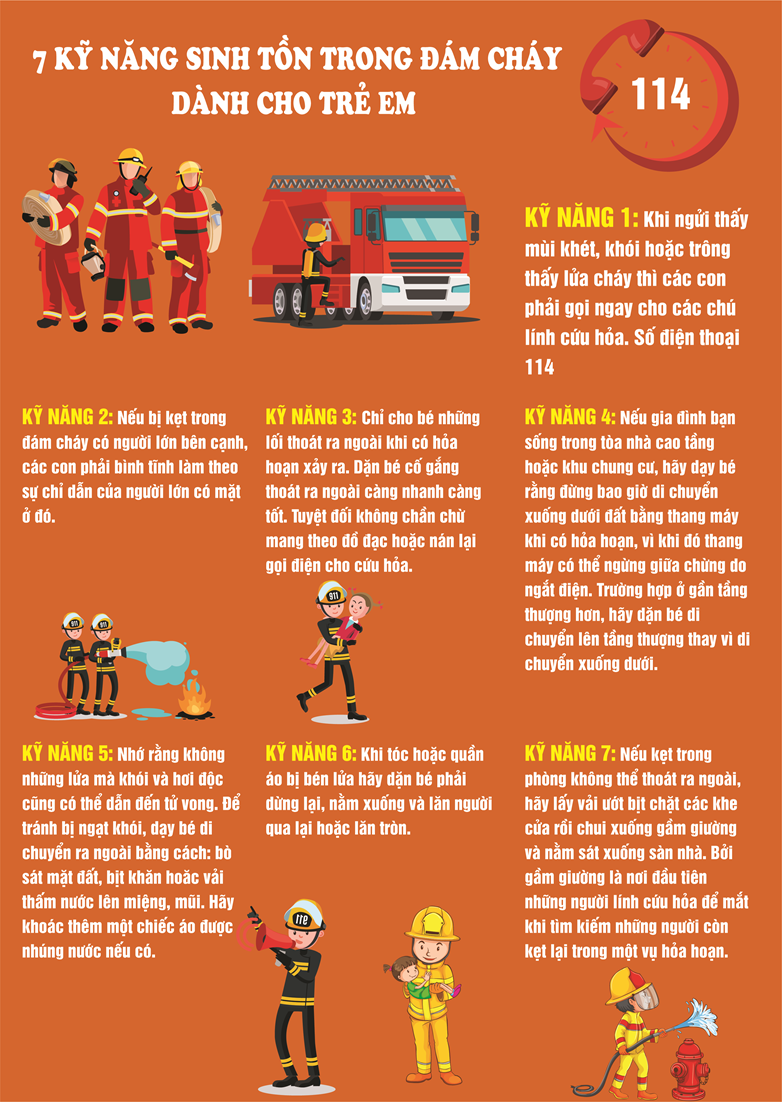Kỹ năng 1: Khi ngửi thấy mùi khét, khói hoặc trông thấy lửa cháy phải chạy ngay ra vùng khói khí, hô hoán báo cho người lớn và gọi ngay cho lính cứu hoả qua số điện thoại 114.