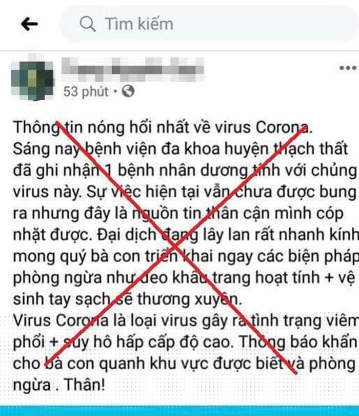 Trước đó, hồi tháng 2/2020, 1 đối tượng đăng lên trang cá nhân với nội dung tại Bệnh viện đa khoa huyện Thạch Thất (Hà Nội) xuất hiện một trường hợp dương tính với virus corona. Trường hợp này bị công an củng cố hồ sơ để xử phạt.