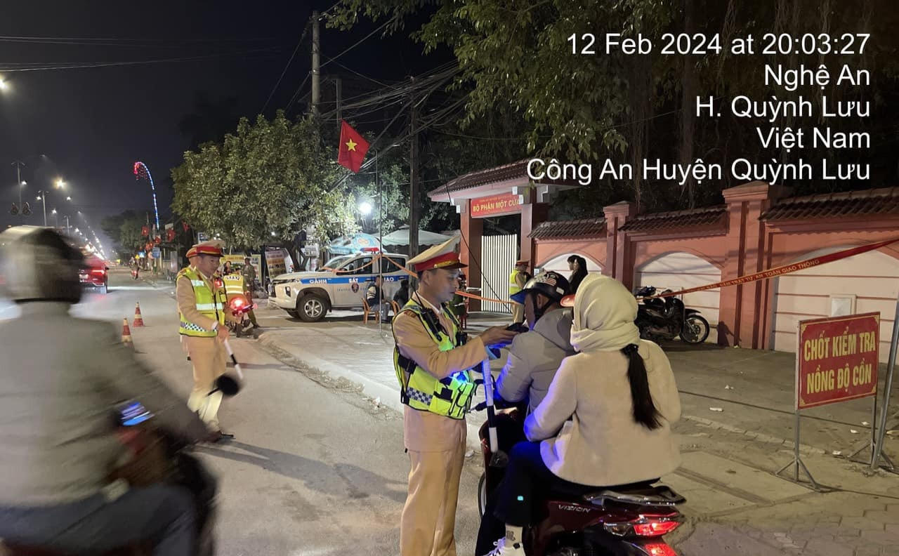 Ngày 12/2 (tức mùng 3 Tết Giáp Thìn 2024), Đội CSGT – TT Công an huyện Quỳnh Lưu (tỉnh Nghệ An) cho biết, thực hiện chỉ đạo của Bộ Công an và Công an tỉnh Nghệ An về tăng cường đảm bảo an toàn giao thông trong dịp Tết Nguyên đán 2024, lực lượng CSGT -TT Công an huyện Quỳnh Lưu đã bố trí lực lượng làm việc "xuyên đêm, xuyên tết 24/24" để bảo đảm an ninh, trật tự, an toàn giao thông phục vụ nhân dân vui xuân, đón tết an toàn, trong đó có việc xử phạt nồng độ cồn.