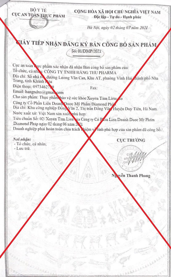 Từ thông tin trên, Cục An toàn thực phẩm cho biết, Công ty TNHH Hằng Thu Pharma chưa đăng ký bản công bố sản phẩm cho Thực phẩm bảo vệ sức khỏe Xuyên Tâm Liên. Hình ảnh giấy tiếp nhận đăng ký bản công bố sản phẩm có số đăng ký: 01/DMP/2021, cấp ngày 2/7/2021, có dấu đỏ của Cục An toàn thực phẩm là giả mạo.