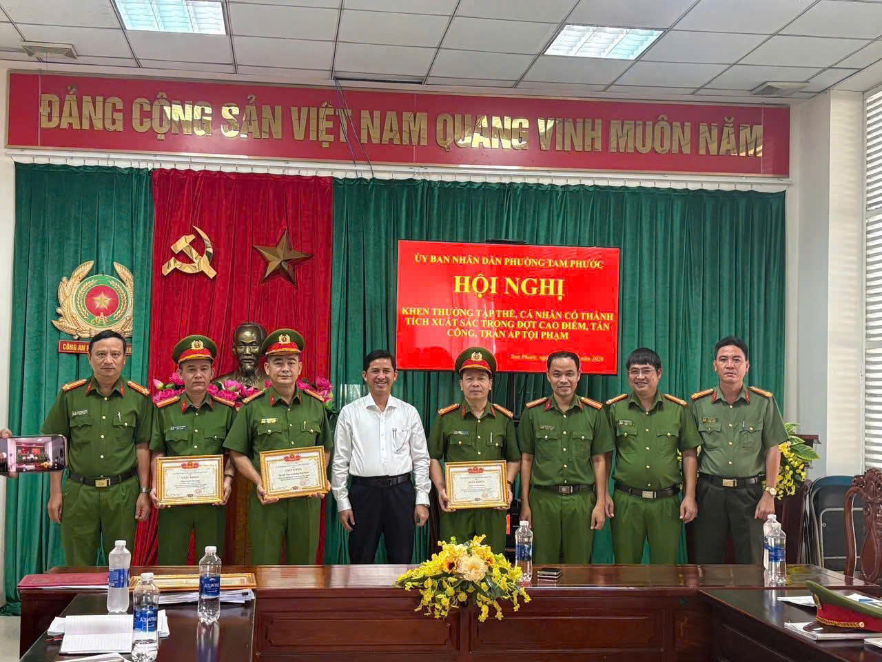 Sáng 23/3/2026, Công an phường Tam Phước tổ chức Hội nghị khen thưởng các tập thể, cá nhân có thành tích xuất sắc trong đợt cao điểm tấn công, trấn áp tội phạm, bảo đảm an ninh trật tự (ANTT) dịp Tết Nguyên đán Bính Ngọ năm 2026.