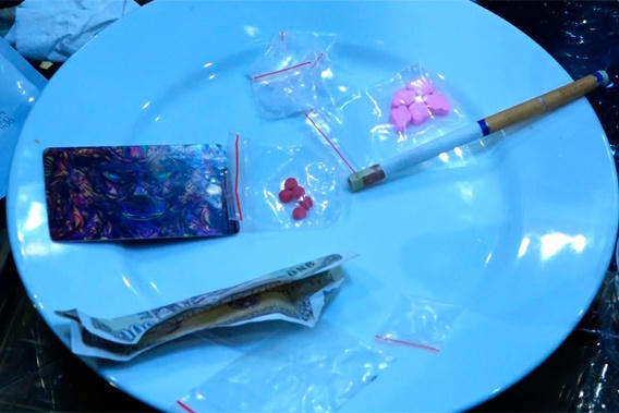 Kiểm tra nhanh, các đối tượng đều dương tính với ma túy; thu giữ trên người một số đối tượng và trong các phòng có nhiều gói nhỏ chứa chất màu trắng dạng đá và một số viên nén màu hồng nghi là ma túy và nhiều dụng cụ để sử dụng ma túy như dĩa và ống hút.
