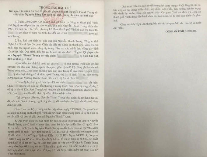 Ngày 25/8, Công an tỉnh Nghệ An đã ra thông cáo báo chí về vụ việc anh Nguyễn Thành Trung tố cáo con gái 6 tuổi bị xâm hại tình dục.