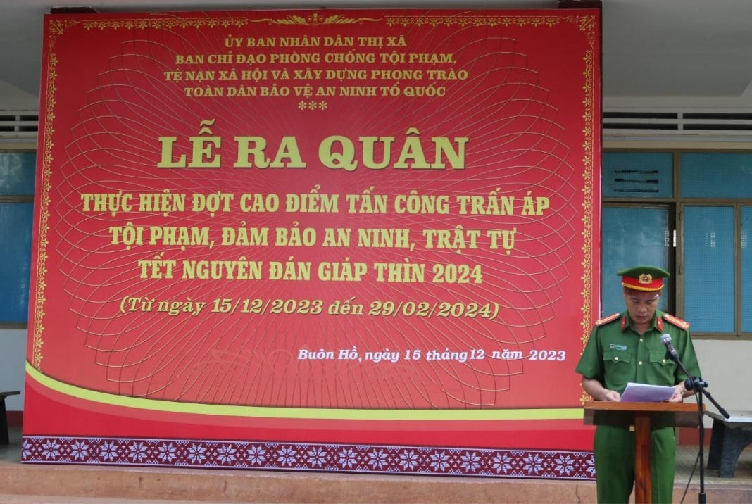 Phát biểu chỉ đạo lễ ra quân, ông Đặng Gia Duẩn, Chủ tịch UBND thị xã Buôn Hồ, Trưởng Ban Chỉ đạo 138 của thị xã yêu cầu các phòng, ban đẩy mạnh công tác tuyên truyền về phòng, chống tội phạm trên các phương tiện thông tin đại chúng, các ứng dụng mạng xã hội, hệ thống thông tin cơ sở. Từng bước đổi mới phương pháp, cách thực hiện phong trào Toàn dân bảo vệ an ninh Tổ quốc theo hướng thiết thực, đi vào cuộc sống của người dân. Tranh thủ vận động người có uy tín trong vùng dân tộc thiểu số, các vị chức sắc tôn giáo tham gia công tác xây dựng phong trào toàn dân bảo vệ an ninh Tổ quốc. Phát huy vai trò của các tổ hòa giải, nhằm phát hiện và xử lý kịp thời các mâu thuẫn từ cơ sở...
