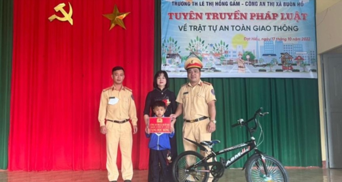 Thiếu tá Trương Thế Việt- Đội trưởng đội CSGT Công an Thị xã Buôn Hồ ( người đội mũ quân phục) trao tặng xe cho học sinh nghèo hiếu học).
