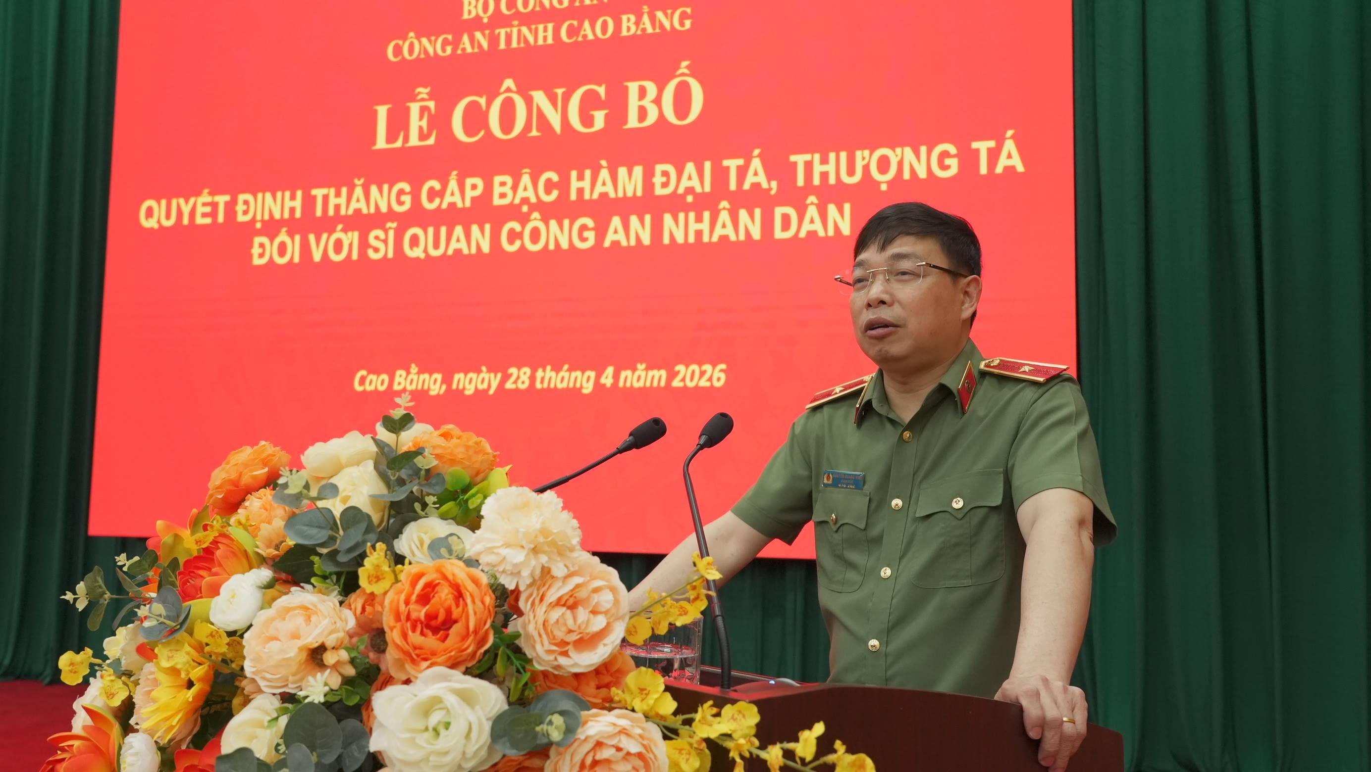 Phát biểu tại buổi lễ, Thiếu tướng Nguyễn Quang Vinh, Giám đốc Công an tỉnh Cao Bằng nhấn mạnh, việc thăng cấp bậc hàm là sự ghi nhận của Đảng, Nhà nước, Bộ Công an đối với quá trình phấn đấu, rèn luyện, cống hiến của cán bộ, chiến sĩ; đồng thời là niềm vinh dự, tự hào, cũng là trách nhiệm lớn lao đối với mỗi đồng chí được thăng cấp bậc hàm trong sự nghiệp bảo đảm an ninh, trật tự, xây dựng lực lượng Công an nhân dân chính quy, tinh nhuệ, hiện đại.