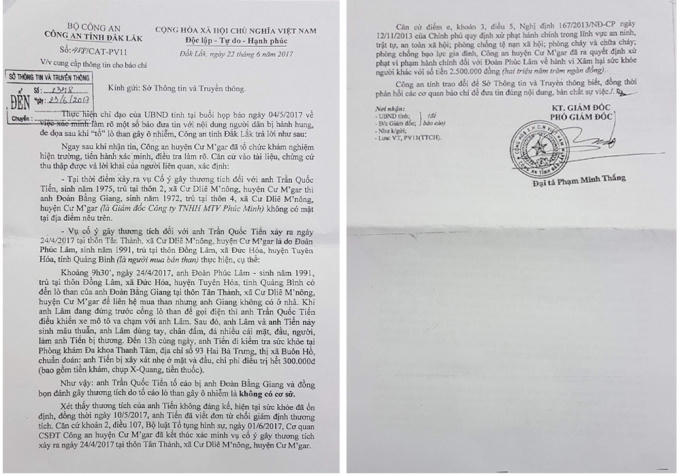 Theo văn bản số 488/CAT-PV11, ngày 22/6 từ Công an tỉnh Đắk Lắk gửi cho Sở Thông tin và Truyền thông về việc cung cấp thông tin cho báo chí, ghi rõ: Tại thời điểm xảy ra vụ Cố ý gây thương tích đối với anh Trần Quốc Tiến, sinh năm 1975, trú tại Thôn 2, xã Cư Dliê M’nông, huyện Cư M’gar thì anh Đoàn Bằng Giang, sinh 1972, trú tại Thôn 4, xã Cư Dliê M’nông, huyện Cư M’gar (là Giám đốc Công ty TNHH MTV Phúc Minh) không có mặt tại địa điểm nêu trên.