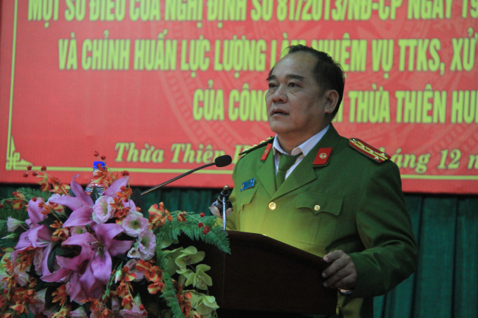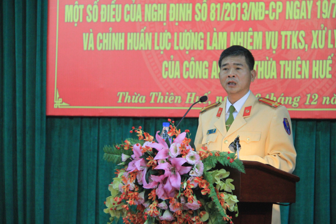 | Trung tá Phạm Ngọc Sơn - Đội trưởng đội tuyên truyền điều tra giải quyết tai nạn giao thông và xử lý vi phạm Công an tỉnh Thừa Thiên Huế đang triển khai Nghị định 97/2017NĐ-CP. |