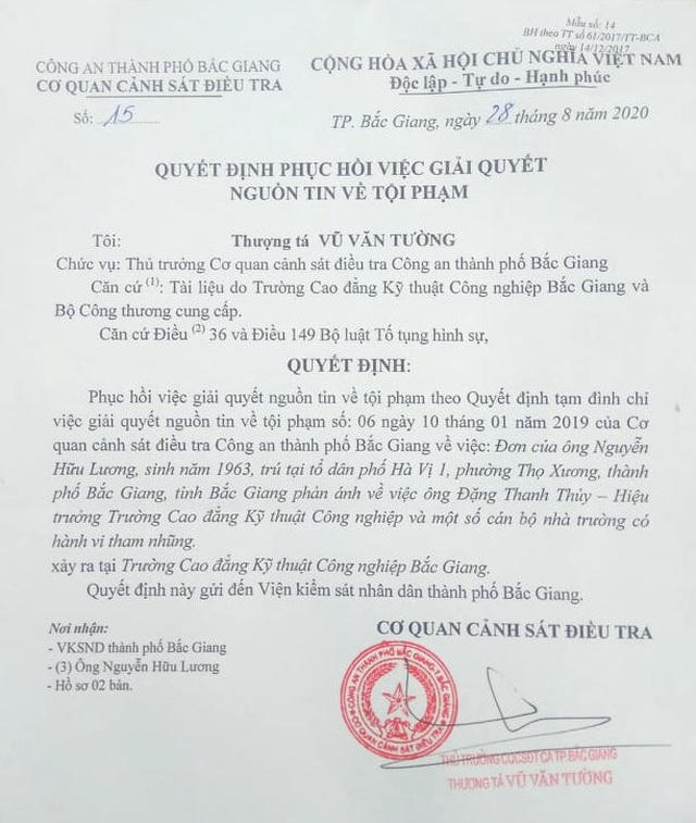 Ngày 28/8, Cơ quan Cảnh sát điều tra (CSĐT) Công an TP Bắc Giang (Bắc Giang) đã ban hành quyết định phục hồi việc giải quyết nguồn tin tội phạm và gửi đến VKSND TP Bắc Giang về việc: Ông Nguyễn Hữu Lương trú tại tổ dân phố Hà Vị 1, phường Thọ Xương, TP Bắc Giang có đơn phản ánh về việc ông Đặng Thanh Thuỷ - Hiệu trưởng Trường Cao đẳng kỹ thuật công nghiệp và một số cán bộ nhà trường có hành vi tham nhũng.