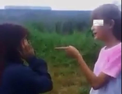 Nữ sinh áo hồng này bắt nữ sinh áo xanh phải quỳ xuống đất rồi tra hỏi về một việc gì đó.
