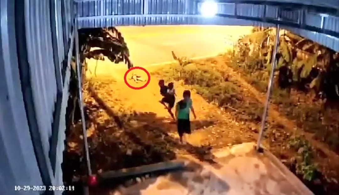Người bố lao từ nhà ra đạp thẳng vào người bé. Ảnh Cắt từ clip.