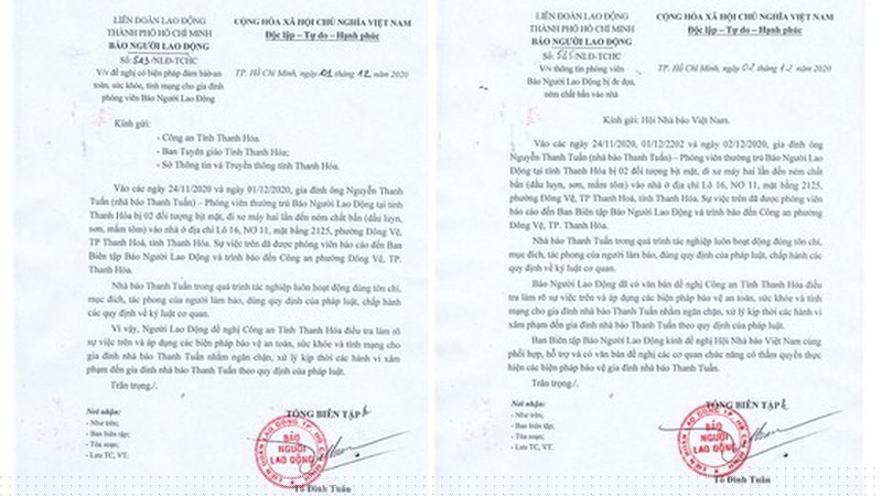 Theo trình báo của ông Nguyễn Thanh Tuấn, phóng viên Báo Người Lao Động thường trú tại Thanh Hóa, vào khoảng 0 giờ 45 phút ngày 24.11, khi gia đình ông đang ngủ thì có 2 đối tượng bịt mặt, đi xe máy đến ném chất bẩn (luyn, sơn, mắm tôm) vào nhà riêng.