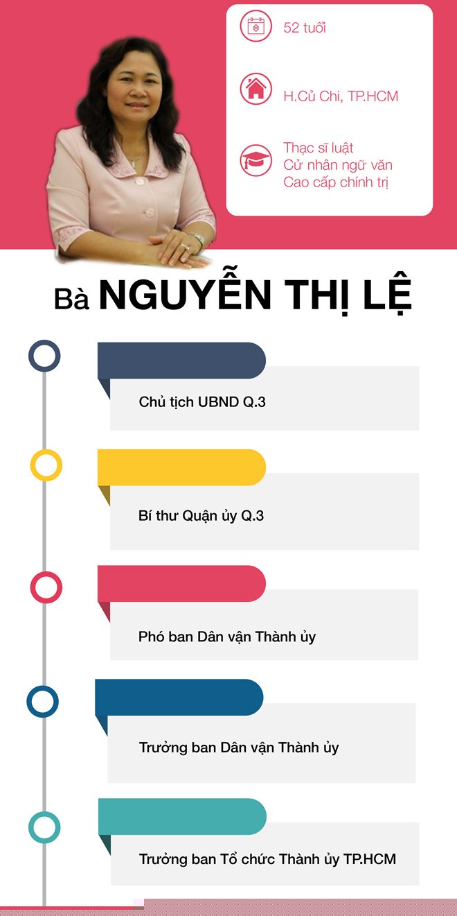 Đồng chí Nguyễn Thị Lệ có nhiều kinh nghiệm, thâm niên làm việc ở quận 3. Năm 2010, đồng chí Nguyễn Thị Lệ được bổ nhiệm giữ chức Chủ tịch UBND quận 3. Năm 2012, đồng chí giữ chức Bí thư Quận ủy quận 3.