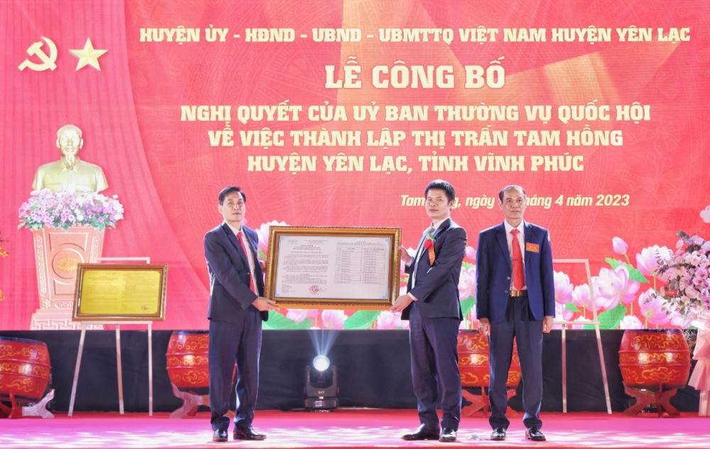 Tối 7/4, huyện Yên Lạc (tỉnh Vĩnh Phúc) công bố Nghị quyết của Uỷ ban Thường vụ Quốc hội khoá 15 về việc thành lập thị trấn Tam Hồng, huyện Yên Lạc.