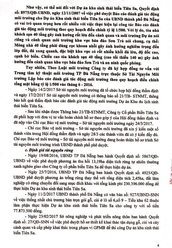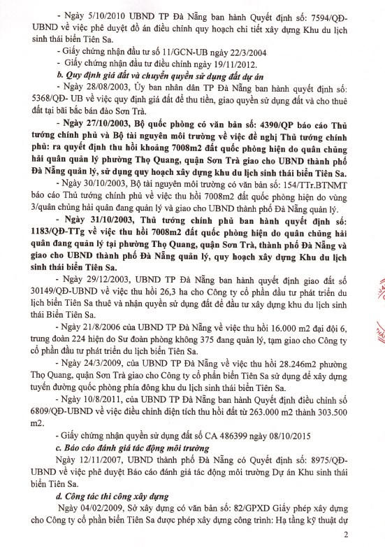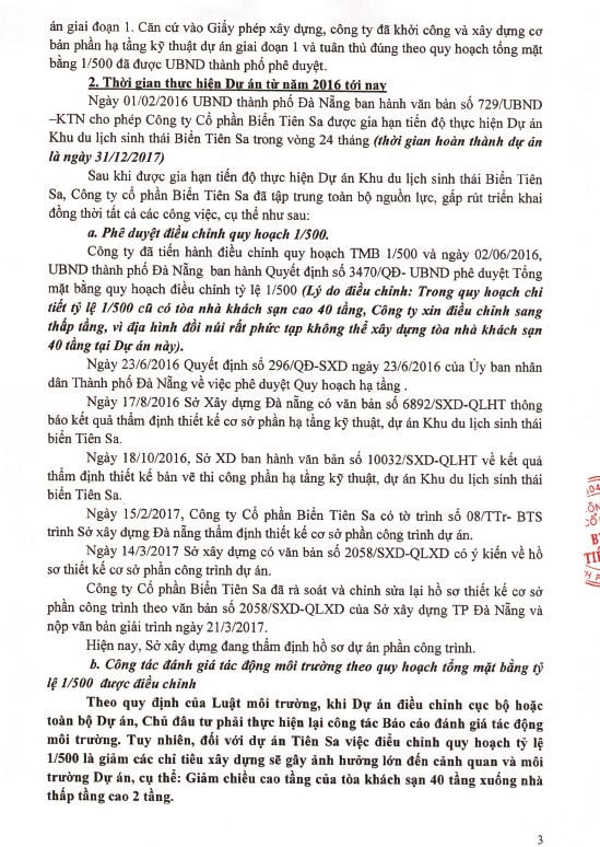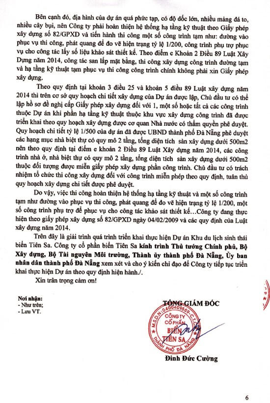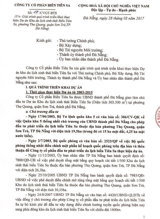 Theo thông tin mới nhất chúng tôi nhận được, liên quan đến vụ việc này, được biết, ông Đinh Đức Cường – Tổng Giám đốc Công ty Tiên Sa đã có văn bản gửi Thủ tướng Chính phủ, Bộ Xây dựng, Bộ Tài nguyên Môi trường, Thành ủy Đà Nẵng và UBND TP Đà Nẵng giải trình quá trình triển khai thực hiện Dự án Khu du lịch sinh thái biển Tiên Sa: