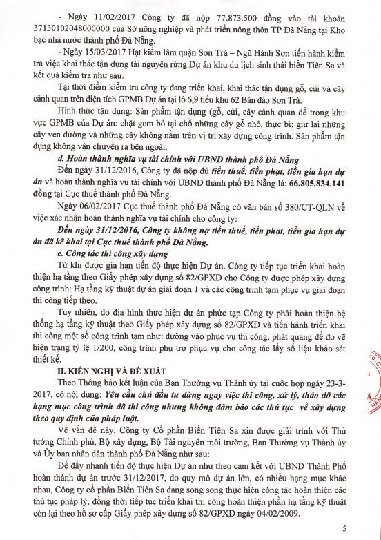 Ban Thường vụ Thành ủy Đà Nẵng đã có văn bản số 190 – TB/TU thông báo đề nghị Ban cán sự Đảng UBND TP chỉ đạo các cơ quan chức năng, yêu cầu Công ty CP Biển Tiên Sa (Công ty Tiên Sa) tháo dỡ các hạng mục công trình đã thi công nhưng không đảm bảo các thủ tục về xây dựng theo quy định.