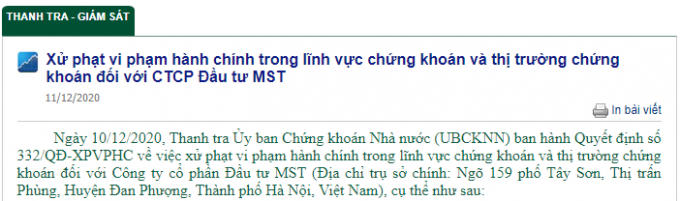Ngày 10/12/2020, Thanh tra Ủy ban Chứng khoán Nhà nước (UBCKNN) ban hành Quyết định số 332/QĐ-XPVPHC về việc xử phạt vi phạm hành chính số tiền 85 triệu đồng, do Công bố thông tin sai lệch trong lĩnh vực chứng khoán và thị trường chứng khoán đối với Công ty cổ phần Đầu tư MST (Địa chỉ trụ sở chính: Ngõ 159 phố Tây Sơn, Thị trấn Phùng, Huyện Đan Phượng, Thành phố Hà Nội, Việt Nam).