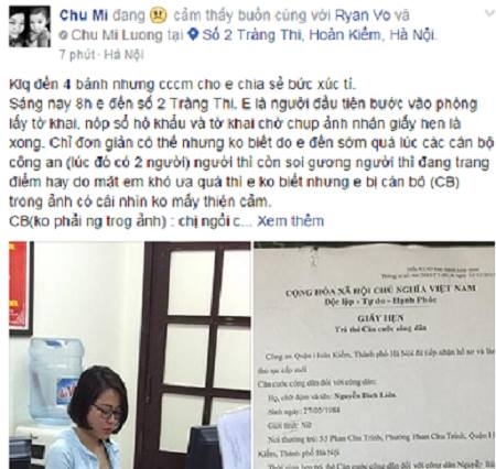 | Trước đó, như Pháp Luật Plus đã thông tin, vào tối 5/4 trên diễn đàn mạng xã hội Facebook Otofun xôn xao truyền tay nhau bài chia sẻ trạng thái bức xúc của Facebooker Chu Mi sau khi chị này đi làm thẻ căn cước công dân tại công an quận Hoàn Kiếm (Hà Nội). Chi tiết xem tại: Hà Nội: Công dân lên Facebook tố nữ cán bộ công an quận Hoàn Kiếm hành dân... là chính |
