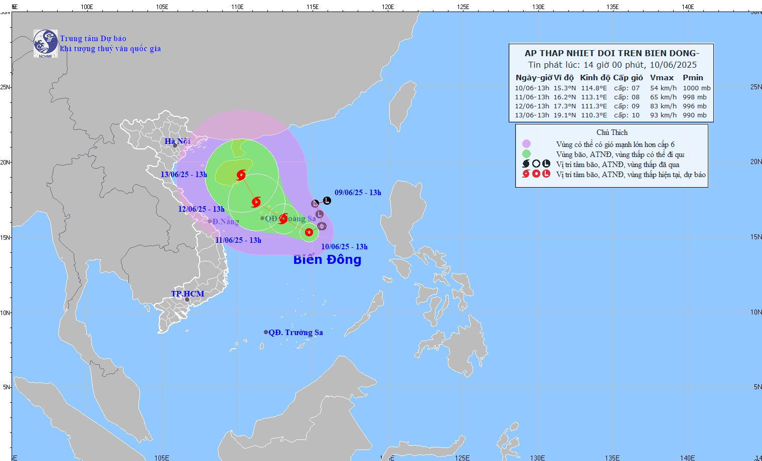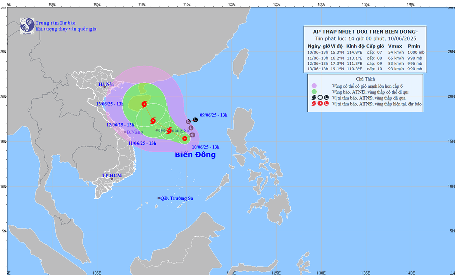 Công điện nêu: Hồi 13 giờ ngày 10 tháng 6 năm 2025, vị trí tâm áp thấp nhiệt đới ở vào khoảng 15,3 độ Vĩ Bắc; 114,8 độ Kinh Đông, cách quần đảo Hoàng Sa khoảng 360 km về phía Đông Đông Nam, sức gió mạnh nhất vùng gần tâm áp thấp nhiệt đới mạnh cấp 6 - 7, giật cấp 9, di chuyển chậm theo hướng Tây Tây Bắc với tốc độ khoảng 5 km/h; dự báo ngày 11 tháng 6, áp thấp nhiệt đới mạnh lên thành bão.