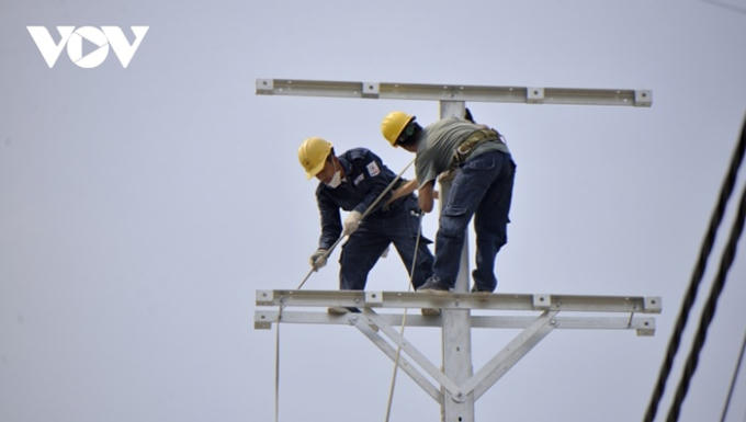 Công nhân điện lực tiến hành di dời các cột điện. (ảnh Hà Khánh)
