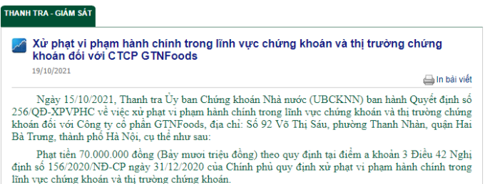 Ngày 15/10/2021, Thanh tra Ủy ban Chứng khoán Nhà nước (UBCKNN) ban hành Quyết định số 256/QĐ-XPVPHC về việc xử phạt vi phạm hành chính số tiền 70.000.000 đồng (bảy mươi triệu đồng), vì đã có hành vi vi phạm hành chính công bố thông tin không đúng thời hạn theo quy định pháp luật trong lĩnh vực chứng khoán và thị trường chứng khoán đối với Công ty cổ phần GTNFoods, địa chỉ: Số 92 Võ Thị Sáu, phường Thanh Nhàn, quận Hai Bà Trưng, thành phố Hà Nội.