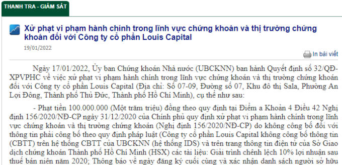 Ngày 17/01/2022, Ủy ban Chứng khoán Nhà nước (UBCKNN) ban hành Quyết định số 32/QĐ-XPVPHC về việc xử phạt vi phạm hành chính trong lĩnh vực chứng khoán và thị trường chứng khoán đối với Công ty cổ phần Louis Capital (Địa chỉ: Số 07-09, Đường số 07, Khu đô thị Sala, Phường An Lợi Đông, Thành phố Thủ Đức, Thành phố Hồ Chí Minh).