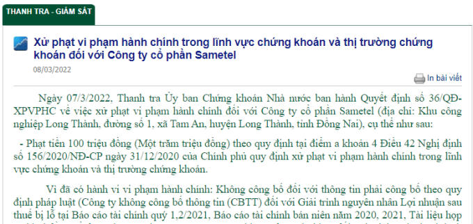 Ngày 07/3/2022, Thanh tra Ủy ban Chứng khoán Nhà nước ban hành Quyết định số 36/QĐ-XPVPHC về việc xử phạt vi phạm hành chính đối với Công ty cổ phần Sametel (địa chỉ: Khu công nghiệp Long Thành, đường số 1, xã Tam An, huyện Long Thành, tỉnh Đồng Nai).