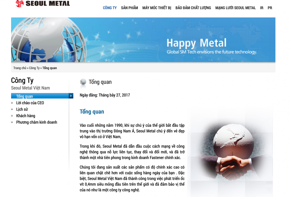 Seoul Metal Việt Nam được thành lập vào năm 2008, hoạt động chính trong lĩnh vực sản xuất ốc vít chính xác cùng các linh kiện điện tử kỹ thuật cao. Doanh nghiệp có trụ sở tại Bắc Ninh, là đối tác cung ứng ốc vít cho các tập đoàn nổi tiếng như Samsung, LG, Panasonic...