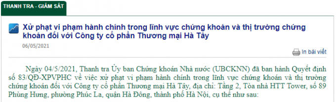 Ngày 04/5/2021, Thanh tra Ủy ban Chứng khoán Nhà nước (UBCKNN) đã ban hành Quyết định số 83/QĐ-XPVPHC về việc xử phạt vi phạm hành chính số tiền 86 triệu đồng, vì đã có hành vi vi phạm hành chính "Công bố thông tin sai lệch" trong lĩnh vực chứng khoán và thị trường chứng khoán đối với Công ty cổ phần Thương mại Hà Tây, địa chỉ: Tầng 2, Tòa nhà HTT Tower, số 89 Phùng Hưng, phường Phúc La, quận Hà Đông, thành phố Hà Nội.