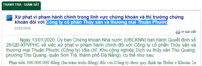 Ngày 13/1/2020, Ủy ban Chứng khoán Nhà nước phát đi thông báo xử phạt vi phạm hành chính đối với Công ty cổ phần Thủy sản và thương mại Thuận Phước.