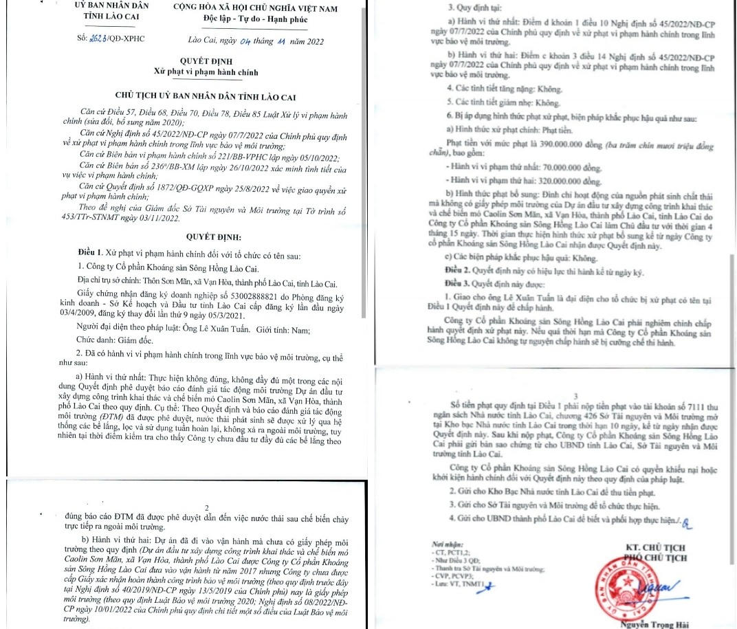 Quyết định xử phạt của UBND tỉnh Lào Cai đối với mỏ cao lanh gây ô nhiễm môi trường của Công ty CP Sông Hồng Lào Cai.