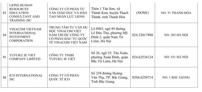 Trung tâm Tư vấn du học Việt Anh - Công ty TNHH Phát triển nhân lực Việt Nam (số 25, Khu A, Nam Thành Công, phường Láng Hạ, Đống Đa, Hà Nội), bị đình chỉ 6 tháng; Trung tâm tư vấn du học BMT (Thôn Phượng Giáo, Thị trấn Thứa, Lương Tài, Bắc Ninh); Công ty CP Hợp tác quốc tế JASA; Công ty TNHH Kim Cương Nghệ An; Công ty CP Cung ứng nhân lực Quốc tế HTL Việt Nam; Công ty TNHH Tư vấn và dịch vụ Minh Quân…
