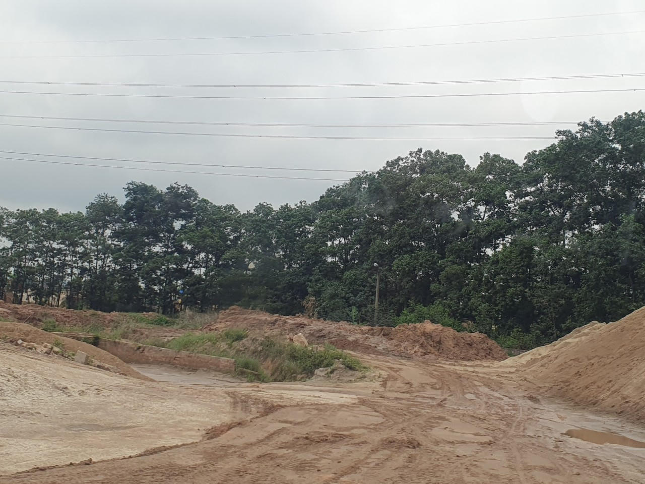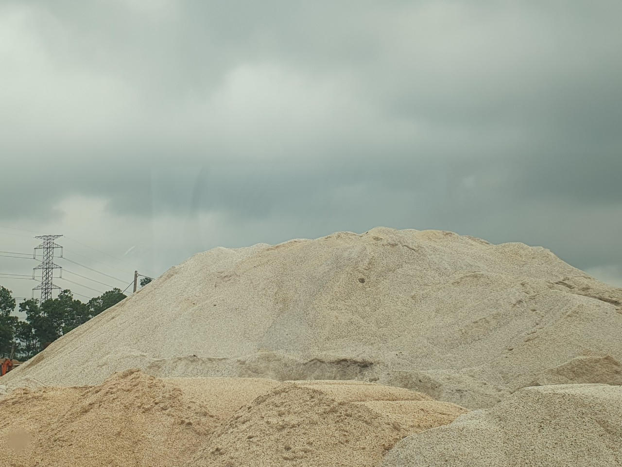 Đường vận chuyển đất nằm phía bên trong các đống cát lớn ở giữa bãi tập kết chứa nguyên vật liệu.