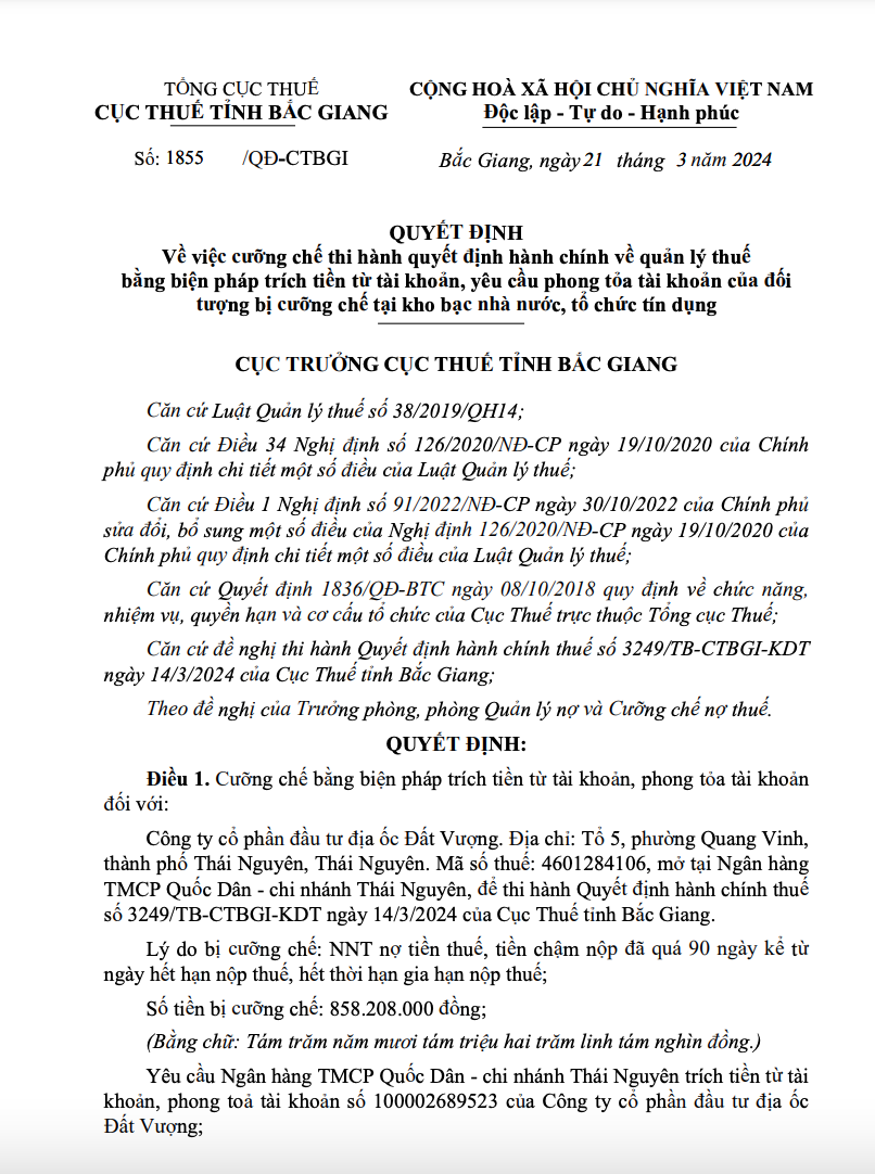 Trước đó, vào tháng 11 năm 2023, Cục thuế tỉnh Bắc Giang cũng đã ban hành quyết định về việc cưỡng chế thi hành quyết định hành chính về quản lý thuế bằng biện pháp trích tiền từ tài khoản, yêu cầu phong tỏa tài khoản đối với Công ty địa ốc Đất Vượng. Số tiền bị cưỡng chế: 429.104.000 đồng.