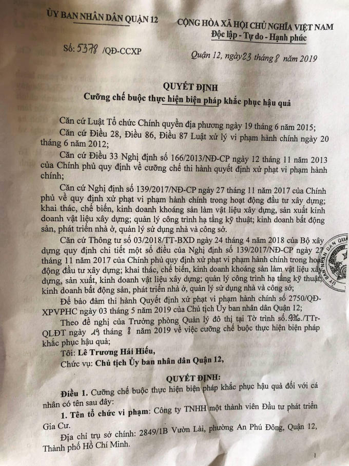Cụ thể, ngày 23/8/2019, UBND Quận 12 đã ra Quyết định số 5378/QĐ-CCXP cưỡng chế buộc thực hiện biện pháp khắc phục hậu quả đối với Cty Gia Cư về việc tổ chức thi công xây dựng công trình không có giấy phép xây dựng tại thửa đất số 147, tờ bản đồ số 65 (tài liệu 2004-2005) thuộc Tổ 11, Khu phố 6, phường Thạnh Xuân, Quận 12, TP HCM.