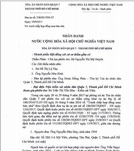 Vừa qua, ông Nguyễn Hữu Huy (ngụ chung cư Mỹ Viên, phường Tân Phú, quận 7) nhận được bản án số 358/2017/DS-ST ngày 29/9/2017 của TAND quận 7, TP HCM.