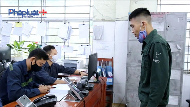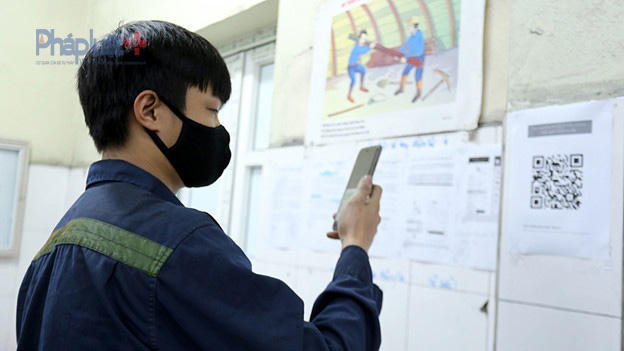 Trong điều kiện dịch bệnh như hiện nay, thợ mỏ trước khi vào nhận việc đều phải khai báo y tế bằng mã QR tại nhà giao ca của phân xưởng.