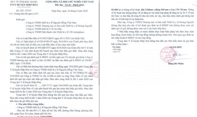 Quyết định trúng thầu tại Trung tâm y tế huyện Hiệp Hoà tỉnh Bắc Giang.