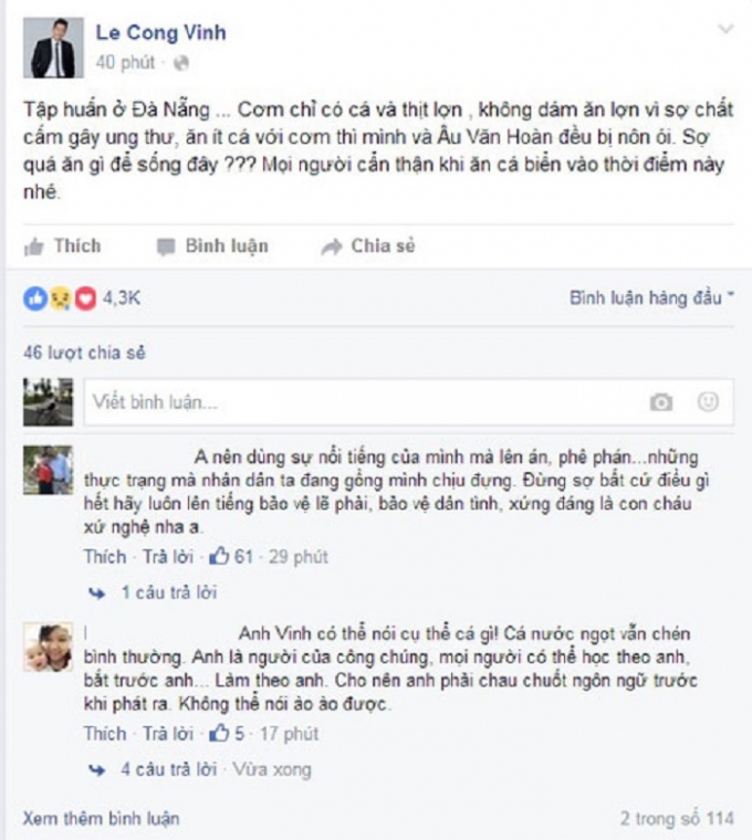 Tuy nhiên, một tai nạn hy hữu đã xảy ra. Chia sẻ trên trang cá nhân, tiền đạo Lê Công Vinh cho biết anh và người bạn thân Âu Văn Hoàn đã bị nôn mửa sau khi ăn cơm với cá tại Đà Nẵng, đồng thời nhắc nhở cộng đồng cẩn thận với món cá biển.
