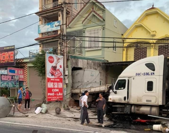 Chiếc container tông vào chiếc xe tải phía trước, đẩy chiếc xe này xuyên qua nhà dân bên quốc lộ 1A.