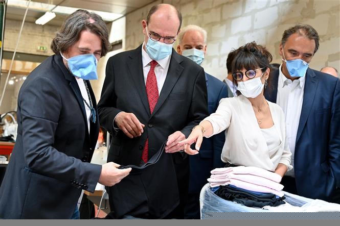 Thủ tướng Pháp Jean Castex (giữa) thăm một xưởng sản xuất khẩu trang ở Roubaix, Pháp, ngày 3/8/2020. Ảnh: AFP/TTXVN