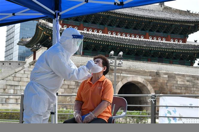 Nhân viên y tế lấy mẫu dịch xét nghiệm COVID-19 cho người dân gần chợ Namdaemun ở thủ đô Seoul, Hàn Quốc ngày 10/8/2020. Ảnh: AFP/TTXVN