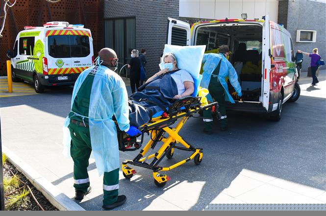 Nhân viên y tế chuyển bệnh nhân mắc COVID-19 lên xe cứu thương tại ngoại ô thành phố Melbourne, bang Victoria, Australia ngày 29/7/2020. Ảnh: AFP/TTXVN