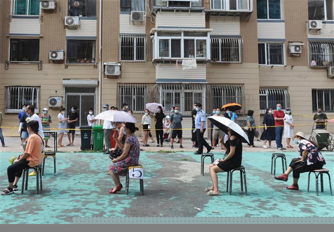 Người dân xếp hàng chờ lấy mẫu xét nghiệm COVID-19 tại một điểm xét nghiệm dã chiến ở thành phố Đại Liên, tỉnh Liêu Ninh, Trung Quốc ngày 28/7/2020. Ảnh: AFP/TTXVN
