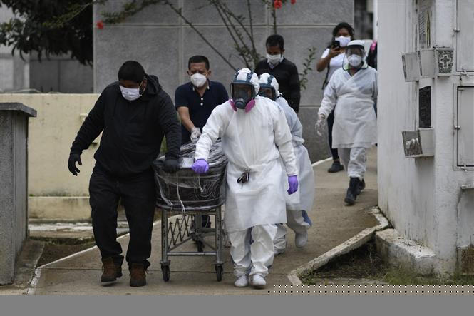 Nhân viên y tế chuyển thi thể bệnh nhân COVID-19 tại Mixco, Guatemala ngày 6/8/2020. Ảnh: AFP/ TTXVN