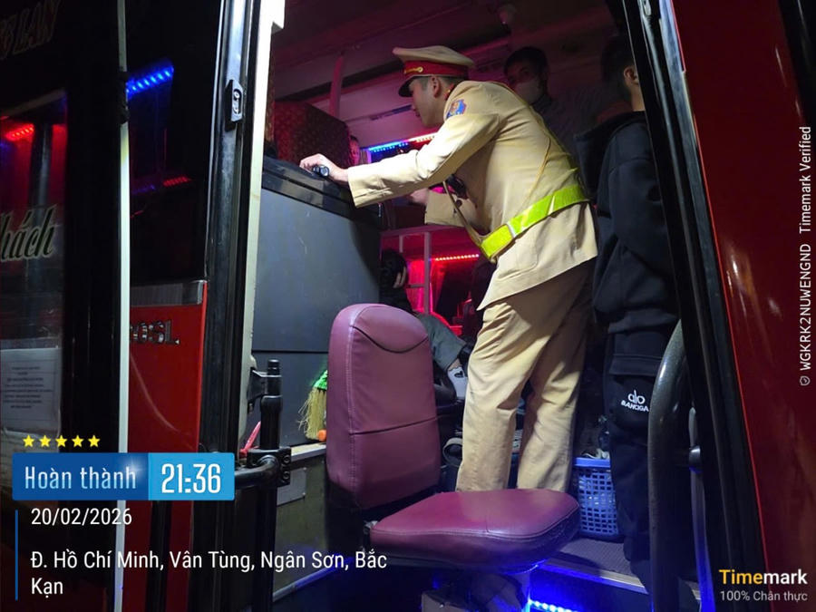 Theo đó, Phòng CSGT bố trí lực lượng, tăng cường tuần tra kiểm soát 24/24 giờ trên các tuyến, địa bàn. Khoảng 21 giờ 35 phút ngày 20/02/2026 tại Km100 đường Hồ Chí Minh, Tổ công tác của Phòng CSGT, Công an tỉnh Thái Nguyên đã dừng và tiến hành kiểm tra xe ô tô khách BKS: 35F-002.xx có kết quả: Lái xe T.Q.H (SN 1981), trú tại Tổ 6, phường Đề Thám, tỉnh Cao Bằng điều khiển xe ô tô khách mang BKS: 35F-002.xx chạy tuyến cố định cự ly lớn hơn 300km thực hiện vi vi phạm: "Chở quá số người quy định được phép chở của phương tiện (63 người/43 chỗ)".