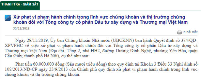 Được biết, trước đó ngày 29/11/2019 Ủy ban Chứng khoán Nhà nước (UBCKNN) ban hành Quyết định số 374/QĐ-XPVPHC về việc xử phạt vi phạm hành chính số tiền 60.000.000 đồng (Sáu mươi triệu đồng), với hành vi vi phạm hành chính không công bố đối với thông tin phải công bố theo quy định pháp luật đối với Tổng công ty cổ phần Đầu tư xây dựng và Thương mại Việt Nam.