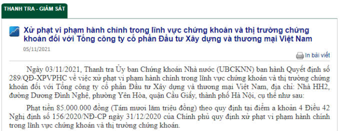 Ngày 03/11/2021, Thanh tra Ủy ban Chứng khoán Nhà nước (UBCKNN) ban hành Quyết định số 289/QĐ-XPVPHC về việc xử phạt vi phạm hành chính số tiền 85.000.000 đồng (Tám mươi lăm triệu đồng), vì đã có hành vi vi phạm hành chính không công bố đối với thông tin phải công bố theo quy định pháp luật trong lĩnh vực chứng khoán và thị trường chứng khoán đối với Tổng công ty cổ phần Đầu tư Xây dựng và thương mại Việt Nam, địa chỉ: Nhà HH2, đường Dương Đình Nghệ, phường Yên Hòa, quận Cầu Giấy, thành phố Hà Nội.